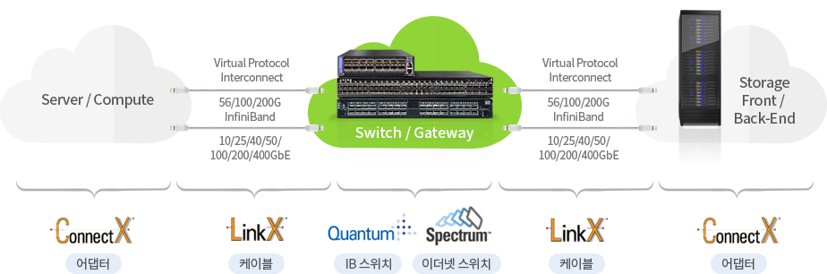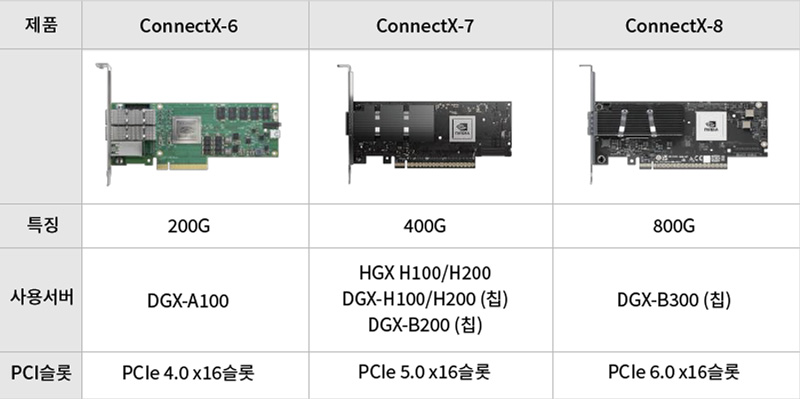 NVIDIA가 자체 설계한 ConnectX칩을 사용하여 다양한 어댑터 및 DPU를 제공하고 있습니다. 보다 빠른 속도와 혁신적인 인-네트워크 컴퓨팅 활용하는 NVIDIA ConnectX InfiniBand 스마트 어댑터는 뛰어난 성능 및 확장성을 달성합니다